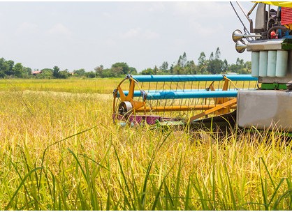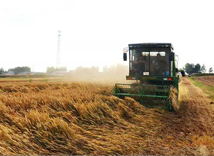 拖拉機和收割機在農場收大米